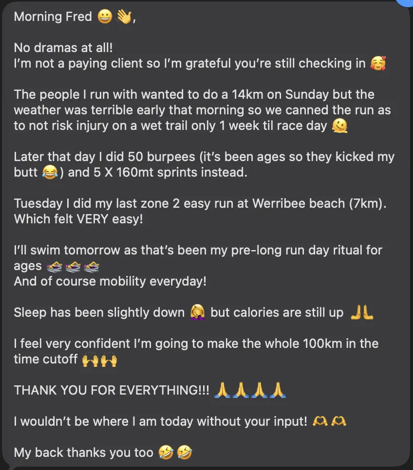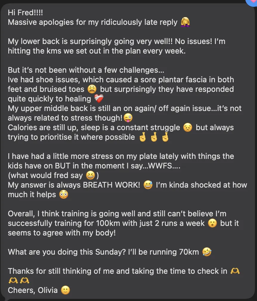 However the most valuable aspect is access, via your coaching software, for any questions you may have at any time - with the ability to get same day answers (on business days), often within the hour. It's like having the coach and physio you used to see once a week or once a fortnight, in your back pocket!